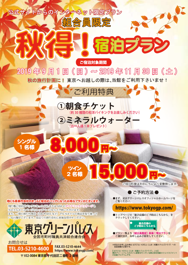 東京グリーンパレス組合員限定『秋得!宿泊プラン』