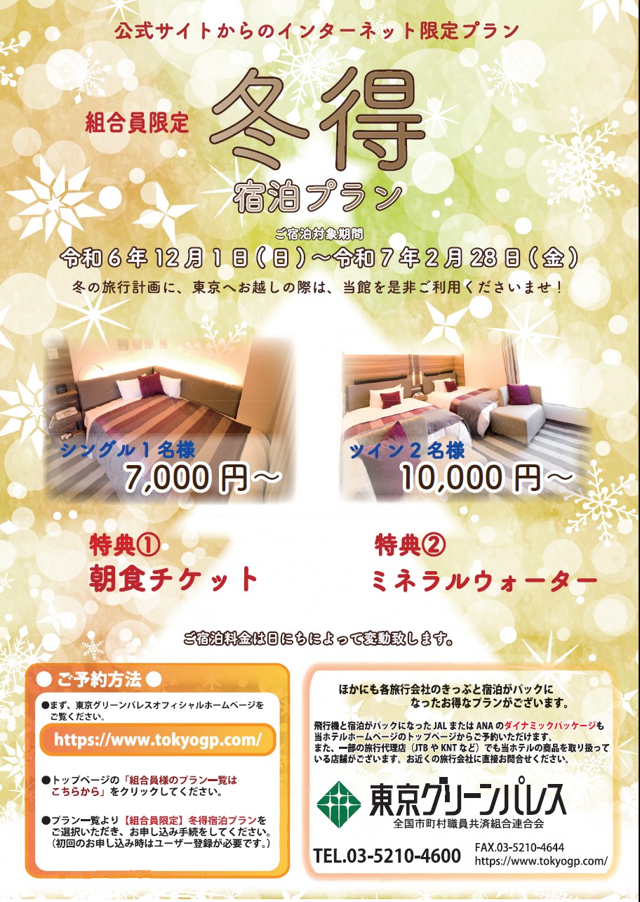 東京グリーンパレス 組合員限定『冬得 宿泊プラン』